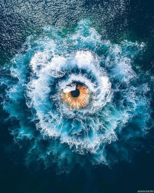 На картинке изображена круглая волна или всплеск, в центре которого изображен глаз. Яркие синие, зеленые и белые цвета позволяют предположить, что снимок сделан в океане. Это креативное изображение глаза в воде.