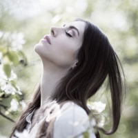 a young woman with closed eyes, appearing to be in a state of peaceful contemplation or enjoyment. She has long