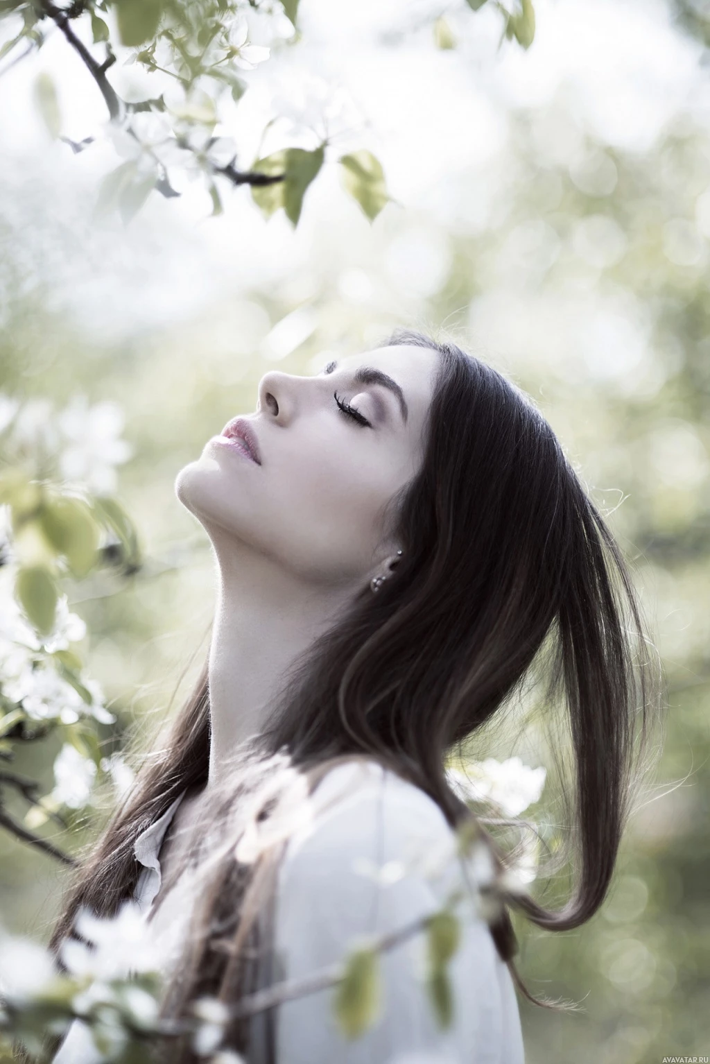 dark hair and her facial expression is serene. Surrounding her are blurred white flowers, which could possibly indicate the presence of