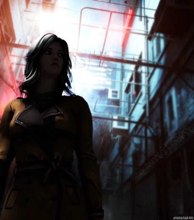 a trench coat and has her hair styled into a short bob cut. The character's expression seems contemplative or serious as she looks directly ahead. The environment suggests a scene from