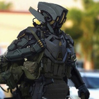 futuristic armor, which suggests that this might be from a science fiction story or film. The armor is sleek and modern-looking with a helmet that has visors or goggles. The character is carrying what appears to be a weapon or equipment on their back. There are also elements such as straps and buckles, indicating the armor's functional design for combat or survival in an advanced