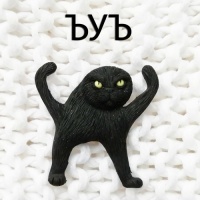 yellow eyes and its arms are extended outwards as if it's stretching. There's text overlaid on the image which reads "byb" in bold,