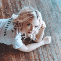 blonde hair and is wearing what appears to be a white top with text on it, although the full text is not visible in the provided crop of the image. The setting looks like