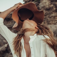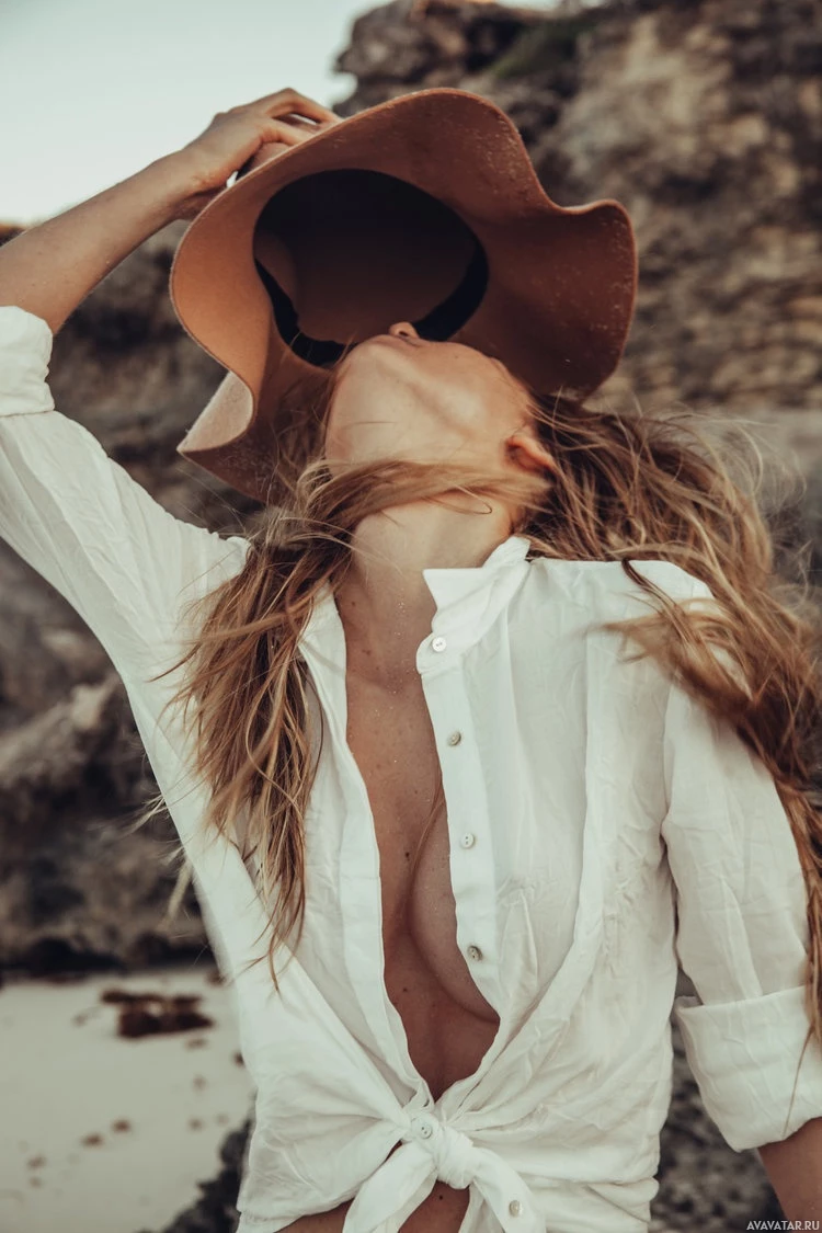 На картинке изображена женщина на пляже. На ней шляпа, а ее волосы развеваются на ветру. Кажется, что ее рубашка частично расстегнута вверху, открывая часть груди. Из-за теплого освещения ее лица кажется, что это либо восход, либо закат солнца.