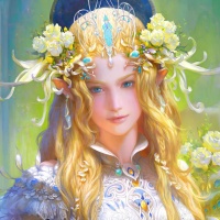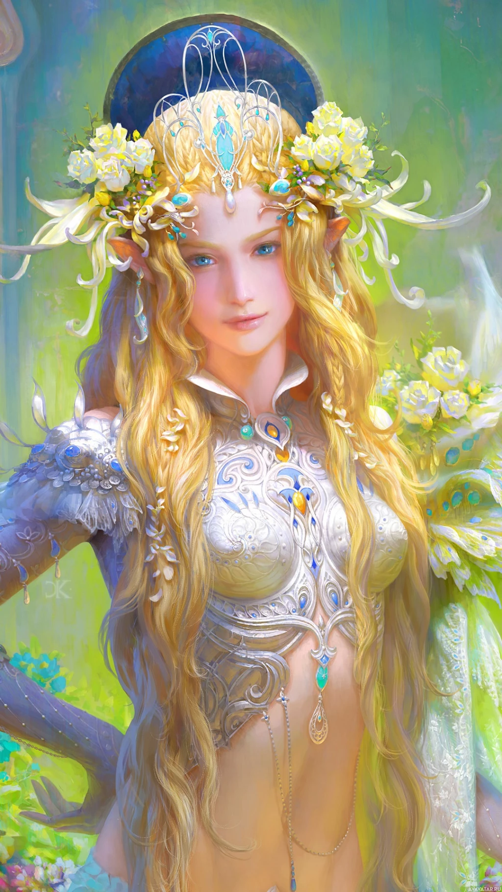 various ornaments and jewelry that give her a regal or magical appearance. The character is depicted in