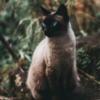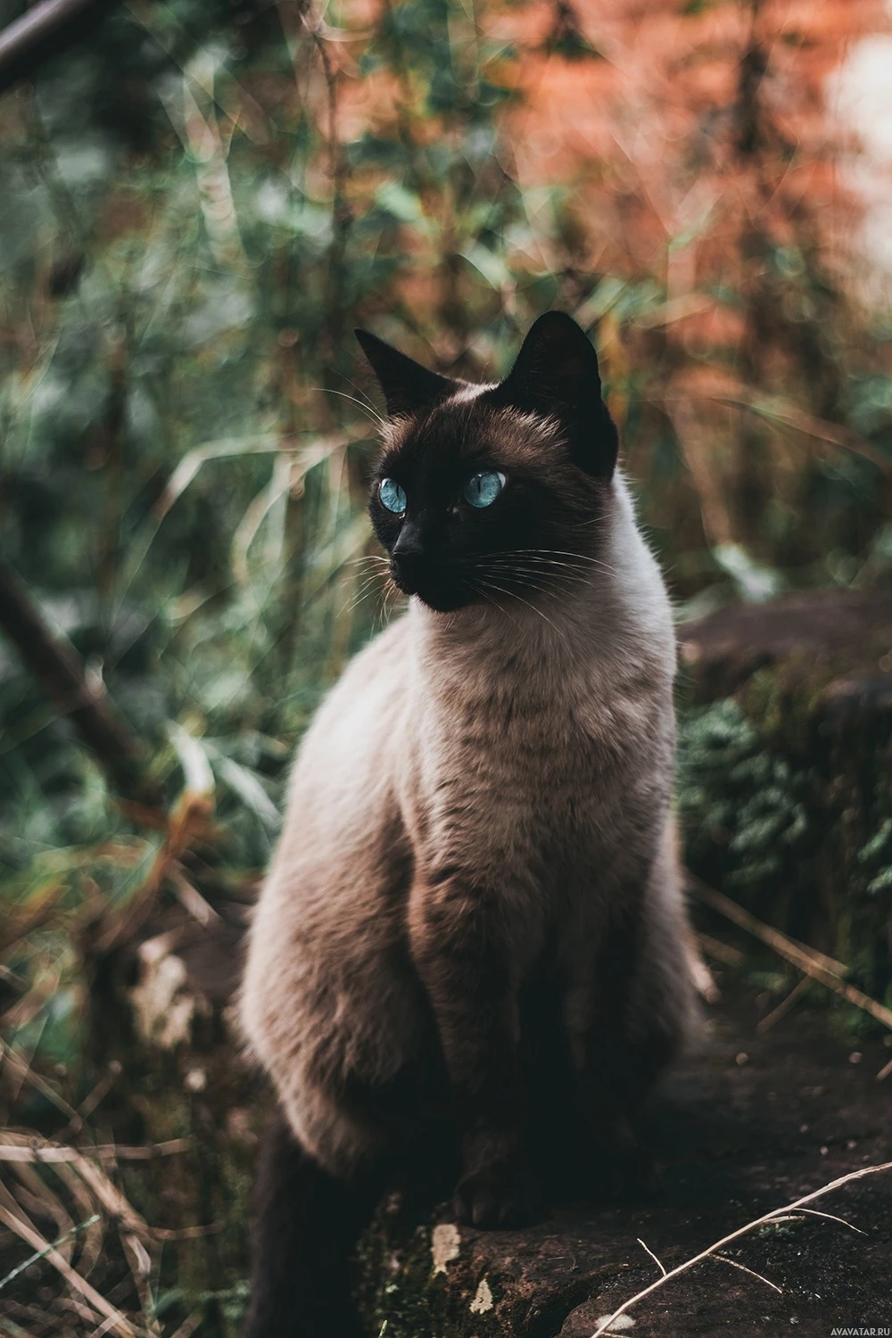 The image shows a Siamese cat sitting in what appears to be a natural,