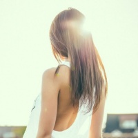 long hair tied back and is wearing shorts, which are visible due to the low-cut design of her shirt. The photo appears to be taken outdoors during the day, possibly in