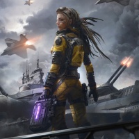 a female character standing amidst what appears to be a chaotic battle scene. She is dressed in a yellow and black suit, which suggests she might be a soldier or combatant. Her hair is styled with braids, and she has