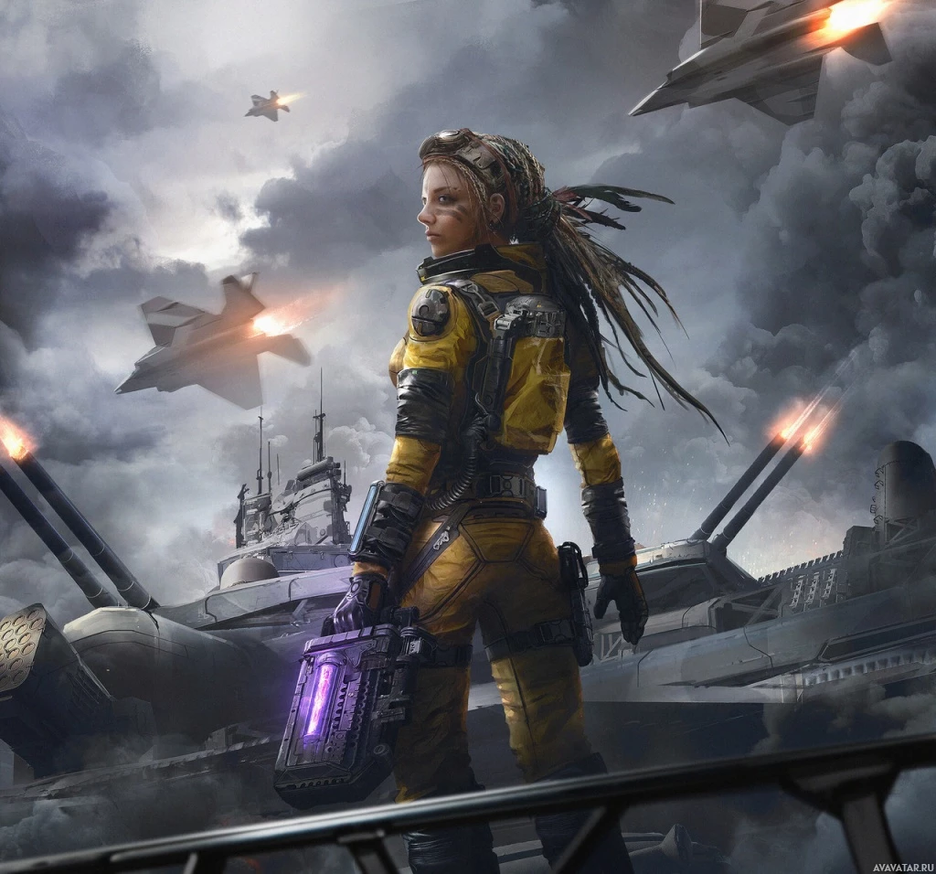 Military aircraft in the background - Smoke and fire indicative of ongoing battle - A battleship with guns firing in the distance - The character is holding a weapon that looks like a rocket launcher or a large gun The overall atmosphere implies action, warfare, and possibly sci-fi or fantasy themes.