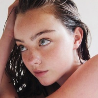 The image shows a young woman with wet hair, possibly after washing it. She is posing for the photograph, looking slightly to her left with a subtle smile. Her expression is relaxed and she seems to be in a casual setting, perhaps at home or in a private space.