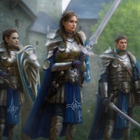 medieval armor and clothing, which suggests a setting that resembles the Middle Ages. One person is holding a sword and wearing a helmet, while the other two are standing with their hands on their hips and wearing swords as well. They appear to be soldiers or warriors, and there is a castle-like
