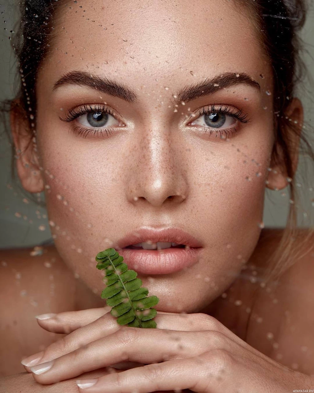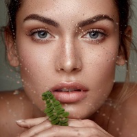 a sense of connection with the viewer. On her lips, she has what looks like a subtle lip gloss, enhancing the overall
