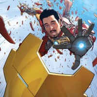 Iron Man, identifiable by its iconic suit and glowing chest arc reactor. To the right is a character from the Marvel Cinematic Universe, who appears to be Tony Stark in the Iron