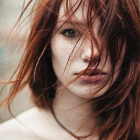 На картинке изображена молодая женщина с рыжими волосами. Ее глаза закрыты, а губы слегка приоткрыты, как будто она испытывает какие-то глубокие чувства или выражает эмоцию. Ее волосы развеваются на ветру, что наводит на мысль о движении в воздухе. Задний план не в фокусе, но похоже, что это могла бы быть городская среда со зданиями и деревьями.