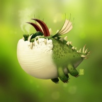 a fantastical dragon-like creature with large wings and a prominent spike on its head, set against a backdrop of greenery that suggests a forest or jungle environment. It appears to be a piece of digital artwork designed to evoke the concept of a mythical or magical creature from