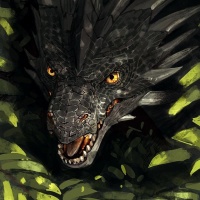 sharp teeth, which contributes to a fierce expression on the creature's face. The artwork is detailed and vibrant, capturing the essence of