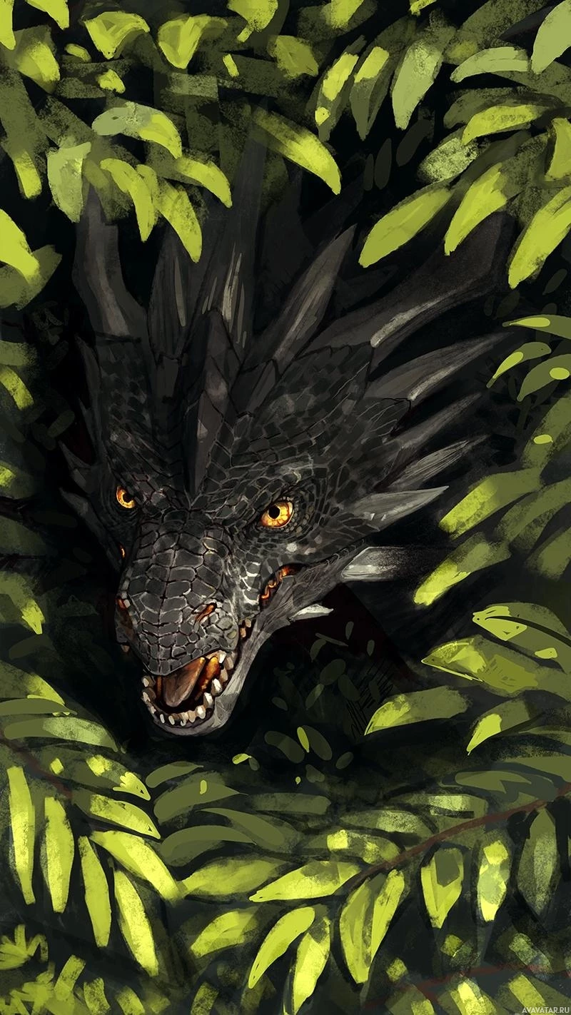 green foliage that appears to be leaves and branches. The dragon's eyes are open wide, giving