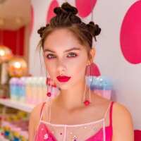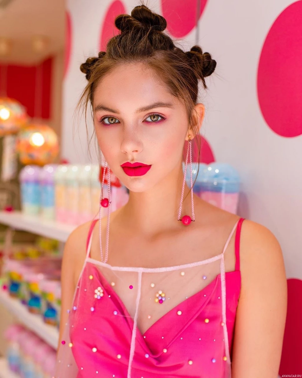 a young woman posing for the camera in what appears to be a store or boutique setting. She has her hair styled into large buns, and she is wearing makeup that includes