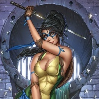 Mutant Ninja Turtles character, April O'Neil. She is holding a sword and posing in what appears to be