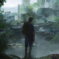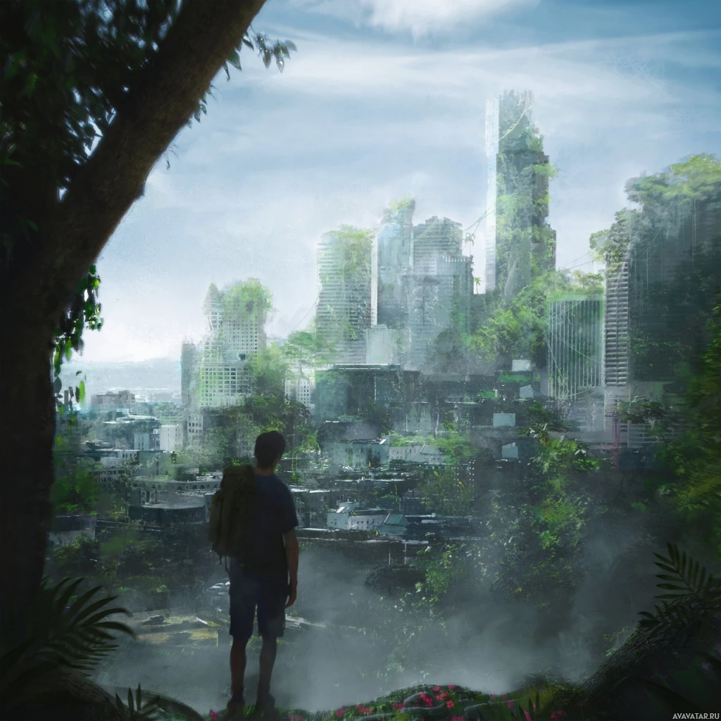 modern architecture, all overgrown with vegetation, suggesting a scene from a science fiction or fantasy narrative where nature has reclaimed urban spaces. The person in the foreground is facing away from the viewer and towards the cityscape, giving
