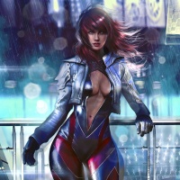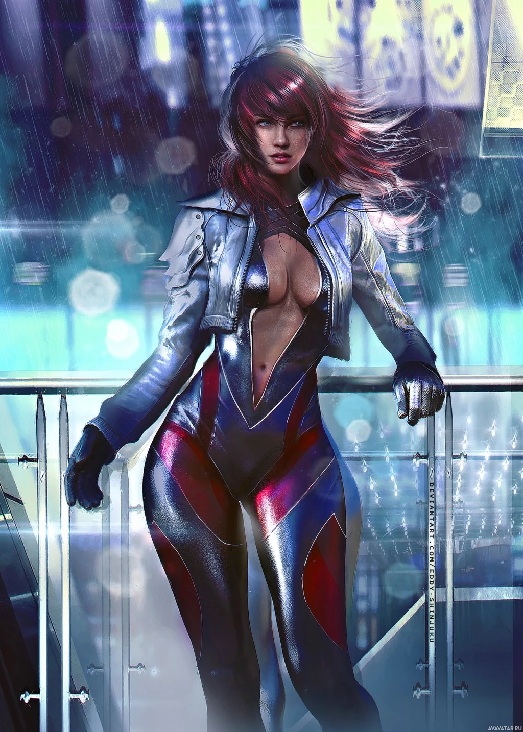 the video game or comic book series, "Cyberpunk 2077." She is wearing