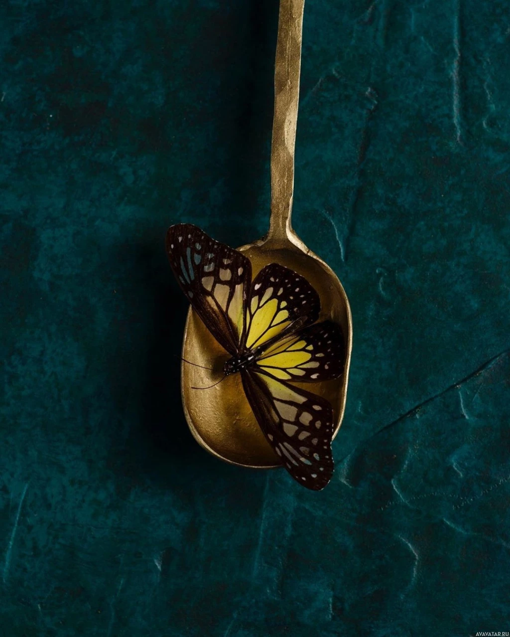 the vibrant colors of the butterfly and the shiny metallic spoon, making the subject stand out prominently.