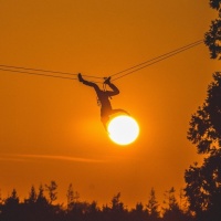 a recreational activity, such as paragliding or kite-surfing. The silhouette of the individual is visible against the sunset background, which creates a striking contrast between