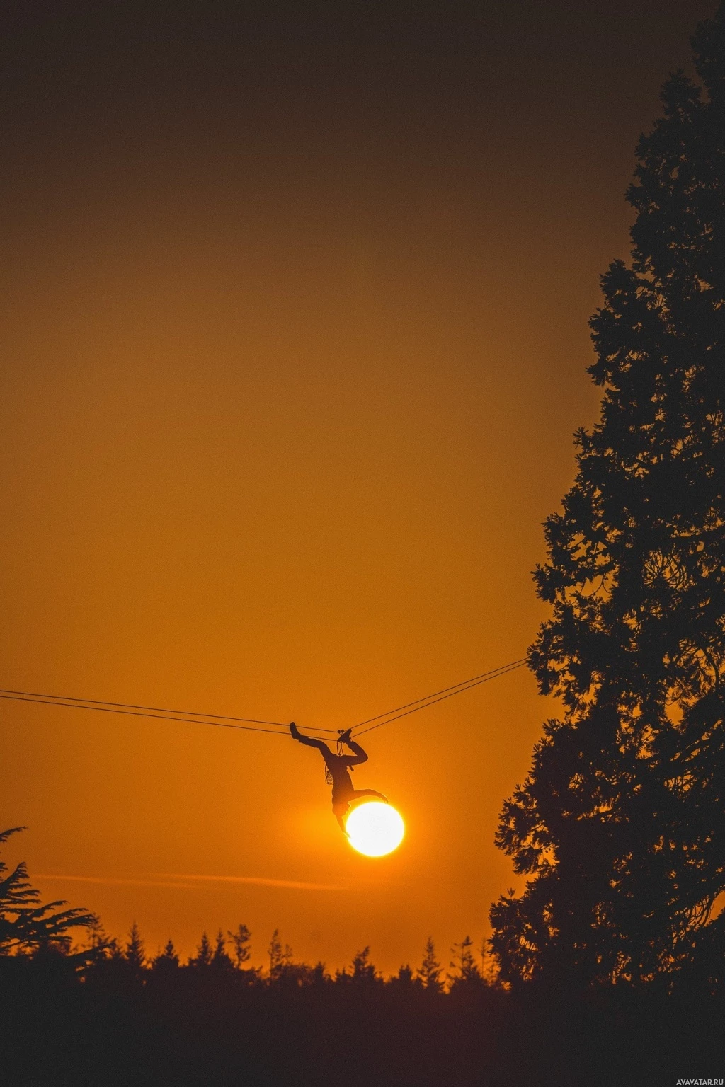 the dark figure and the warm, illuminated sky. The sun appears low on the horizon, indicating that it's either dawn or dusk. There are trees visible in the foreground on both sides of the image, adding to