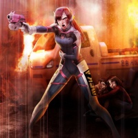 a chaotic scene with fire and smoke, indicating that she may be in the middle of an intense battle or operation.