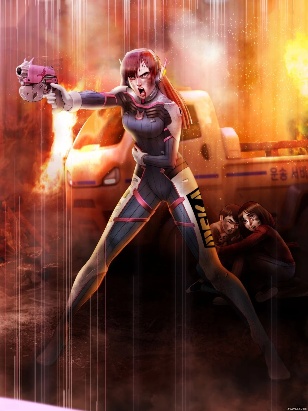 the video game Overwatch, specifically D.Va, who is depicted in her hero pose with one