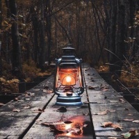 The image features a lantern placed on a wooden plank or bridge, with the setting appearing to be autumnal in nature due to the fallen leaves and possibly the color of the trees. The light from the lantern casts shadows around it, creating a serene and somewhat mystical atmosphere.