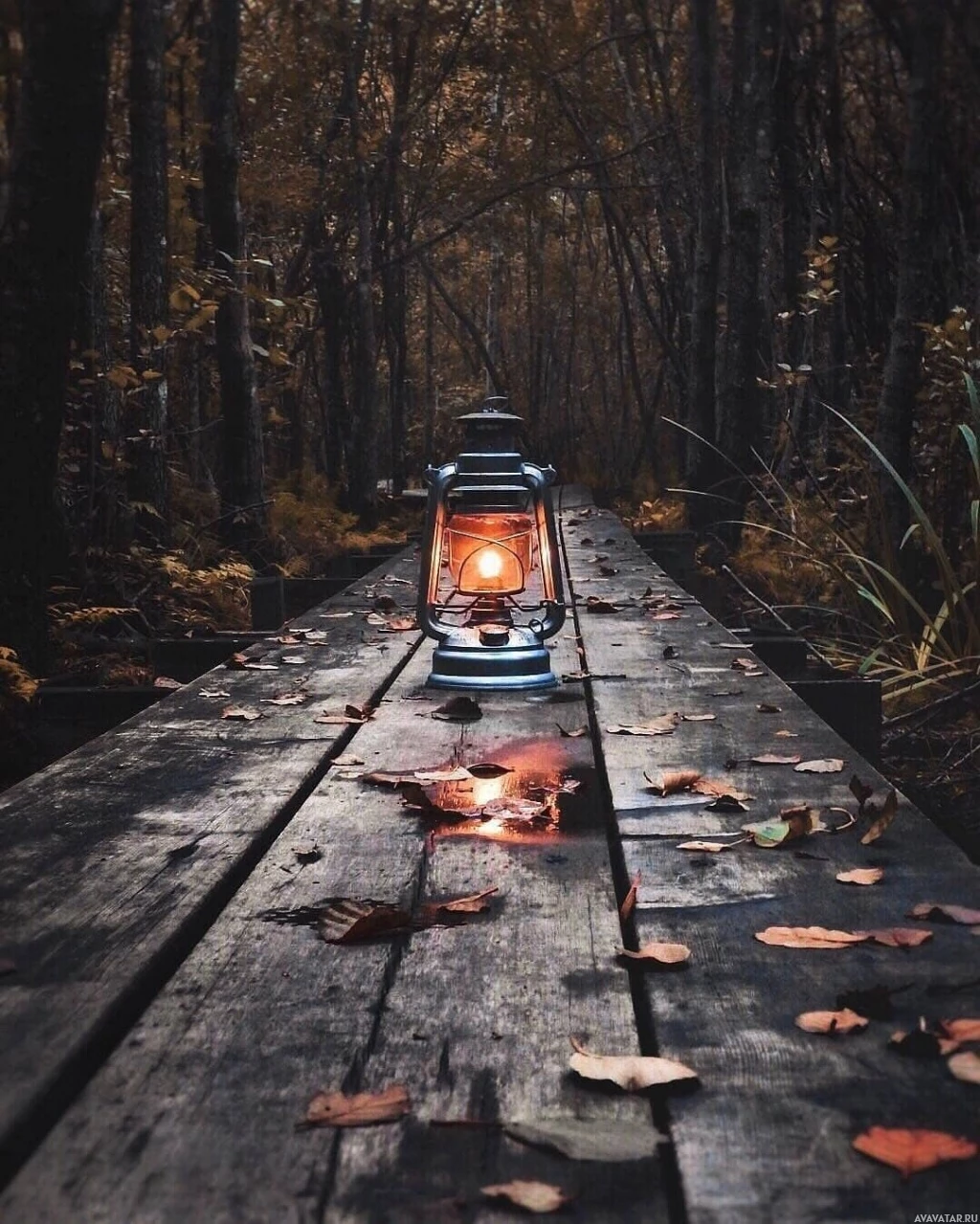 На картинке изображен фонарь, установленный на деревянной доске или мосту, а окружающая обстановка напоминает осеннюю из-за опавших листьев и, возможно, цвета деревьев. Свет от фонаря отбрасывает тени вокруг него, создавая безмятежную и немного мистическую атмосферу.