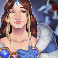blonde hair, a blue outfit, and a staff. This illustration captures her in-game appearance, which includes a helmet that has a crystal on it.