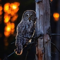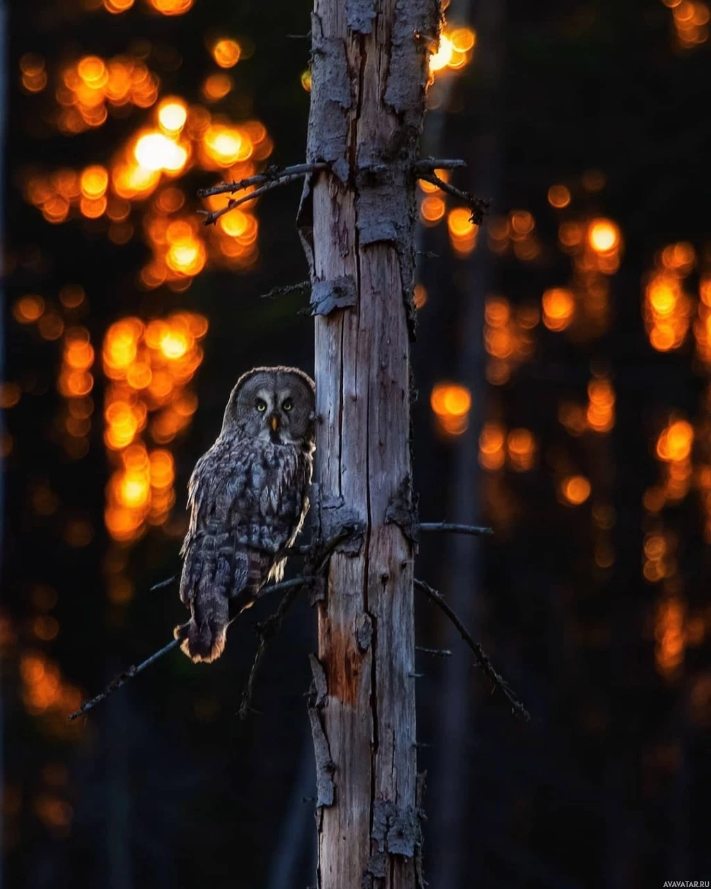 На картинке изображена сова, сидящая на ветке дерева в сумерках или на рассвете, о чем свидетельствуют теплые оранжевые и желтые оттенки неба. Это может быть изображение животного, в частности, с изображением птицы, которой в данном случае является сова.
