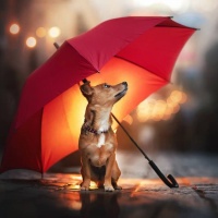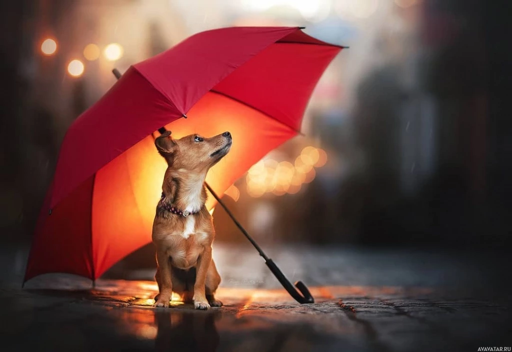 a red umbrella providing shelter from what appears to be rain or snow. There are lights in the background, suggesting that this scene takes place at nighttime or during an overcast day with limited