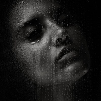 This is a black and white photograph of a woman. She has closed eyes, and her face appears to be wet, suggesting she might have been crying or the photo was taken during rain. The image captures