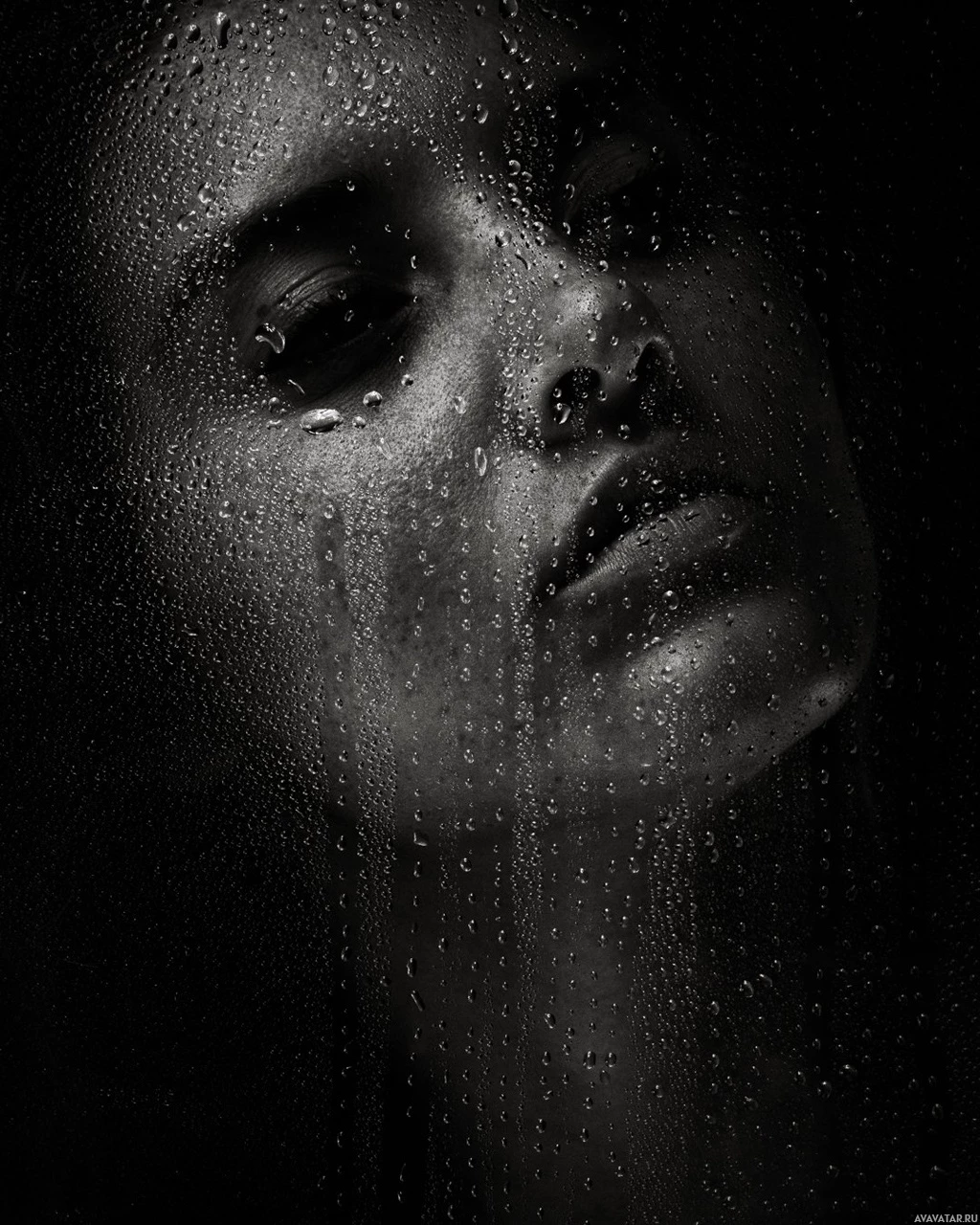 Это черно-белая фотография женщины. У нее закрыты глаза, а лицо кажется мокрым, что наводит на мысль о том, что она, возможно, плакала или фотография была сделана во время дождя. На картинке запечатлен эмоциональный момент.