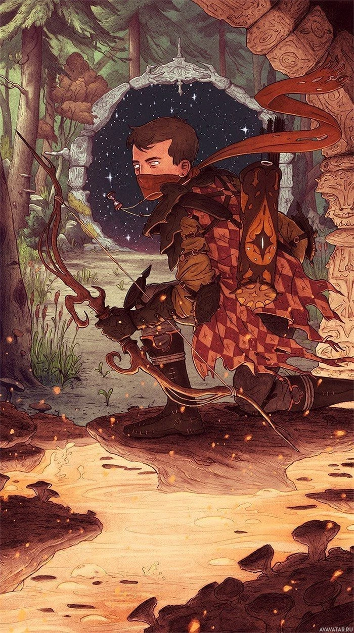 The image depicts an illustration of a character that appears to be from a fantasy or adventure-themed story. The character is wearing what looks like armor and holding a bow, suggesting they might be on a quest or