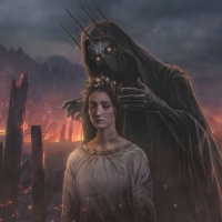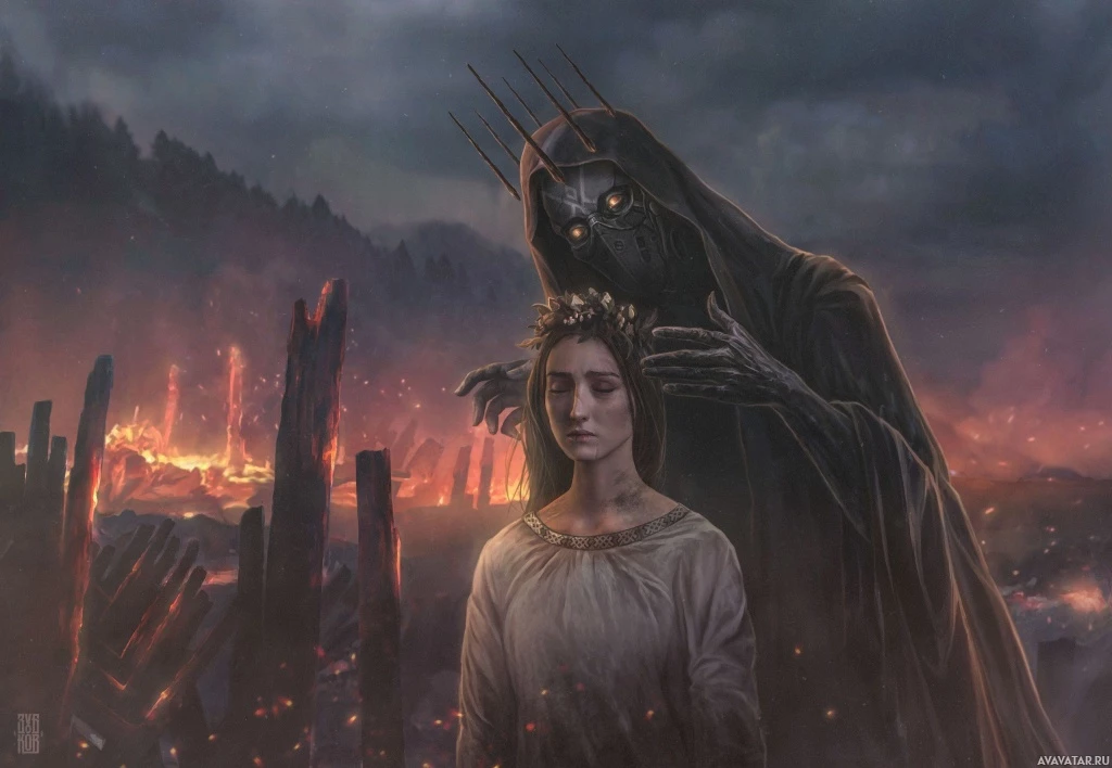 a desolate landscape with flames and ruins, reinforcing the sense of a dire situation. The male character is cloaked in black, which often signifies evil or menace in