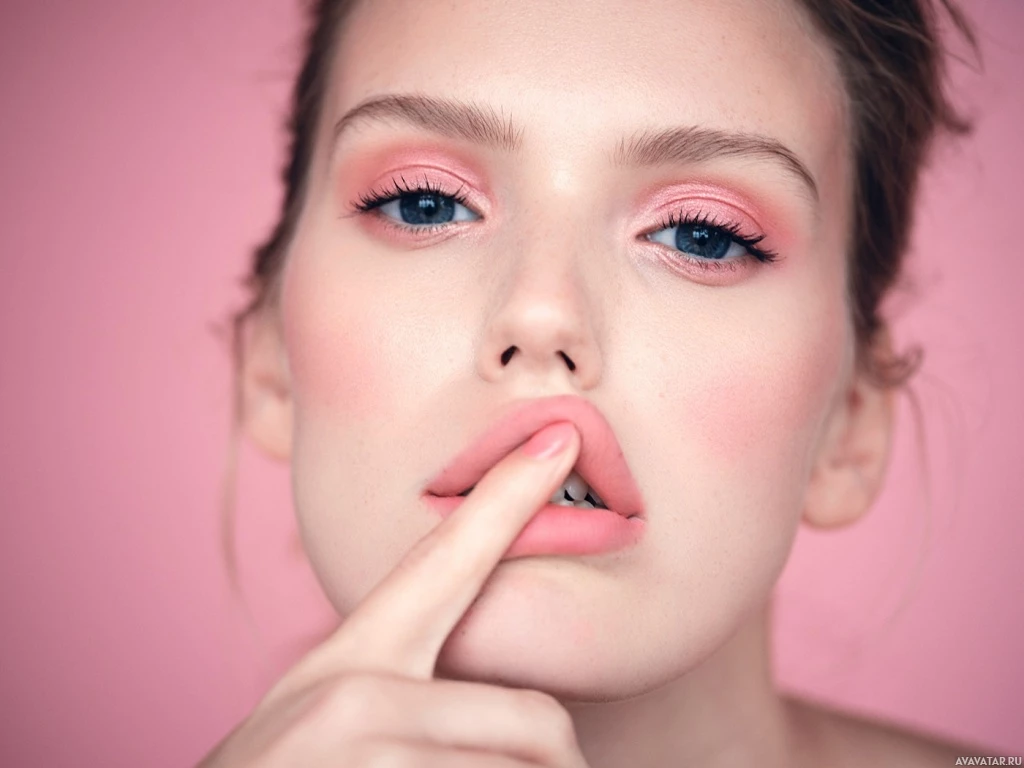 makeup look. Her lips are a prominent feature, accentuated by the use of a pink-toned lipstick or gloss. Her eyes are enhanced with what appears to be light blue