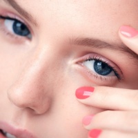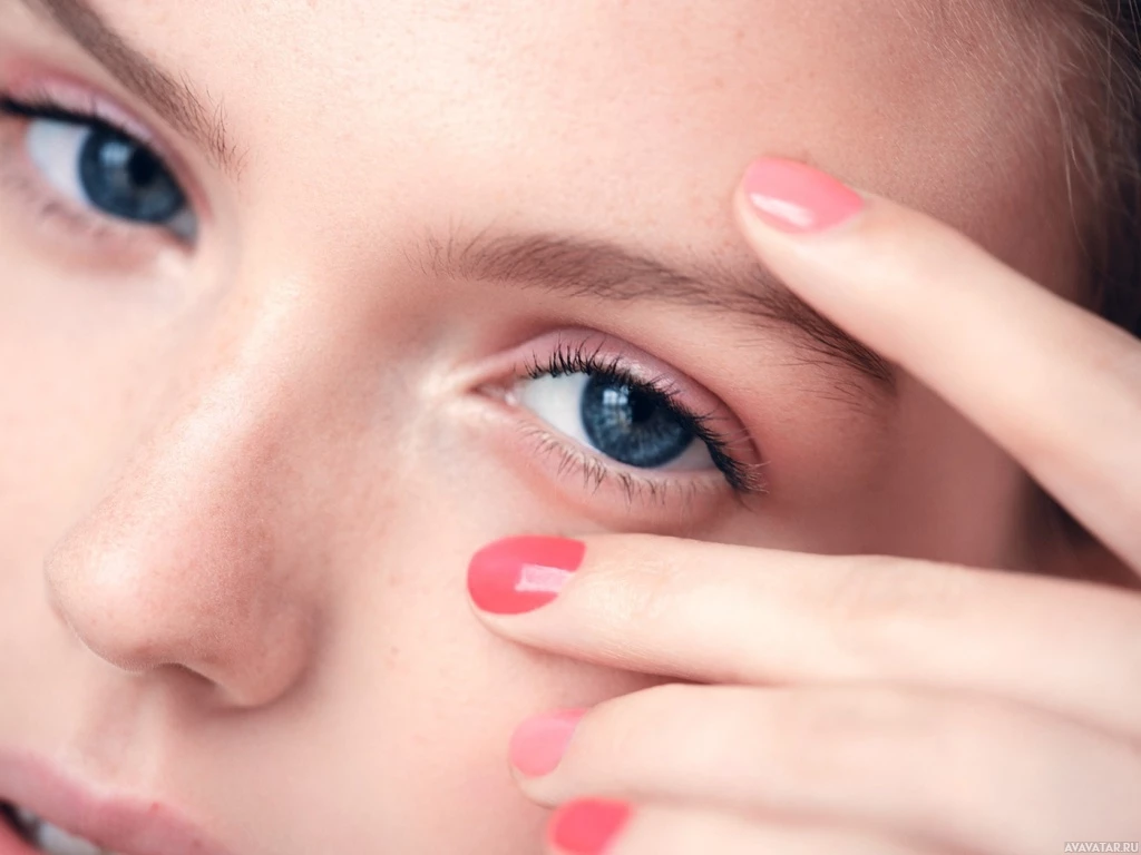 blue eyes. The focus is on the eyebrows and part of the cheekbones, emphasizing the area around the eyes. The person has pink-