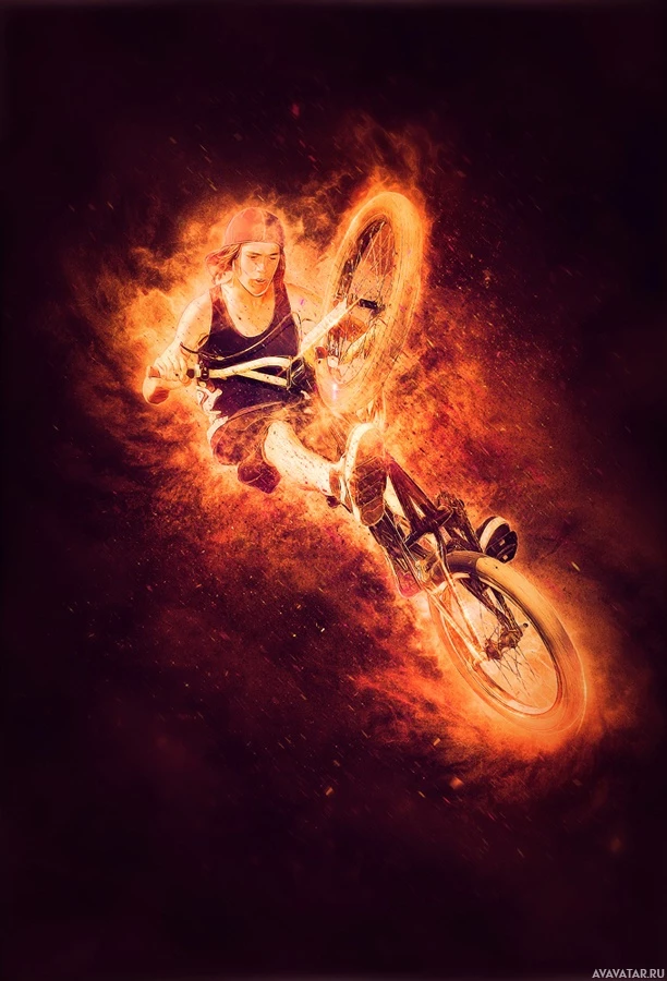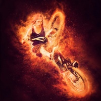 the impression of motion and intensity, possibly suggesting she is racing or performing a stunt on her bike. The background has an orange-