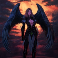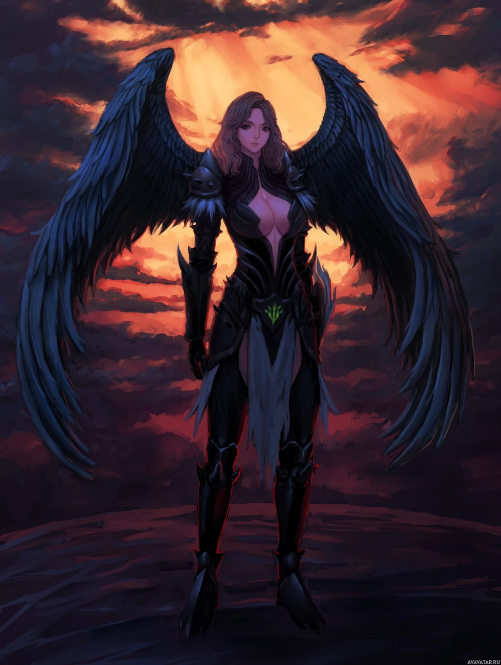 large wings, often associated with celestial entities in many mythologies and folklore. The character is wearing armor and has a helmet, suggesting they are designed for battle or protection. The artwork features a dramatic sky background with dark clouds and what appears to be the sun or moon setting, adding to