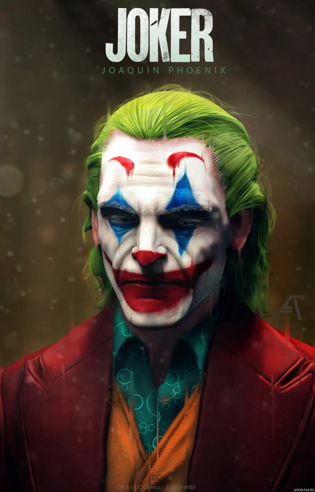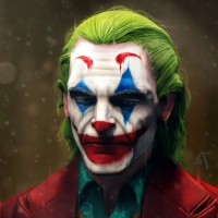 The image depicts the character Joker from the movie "Joker." The character is portrayed with his iconic white skin,