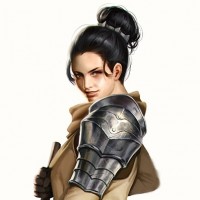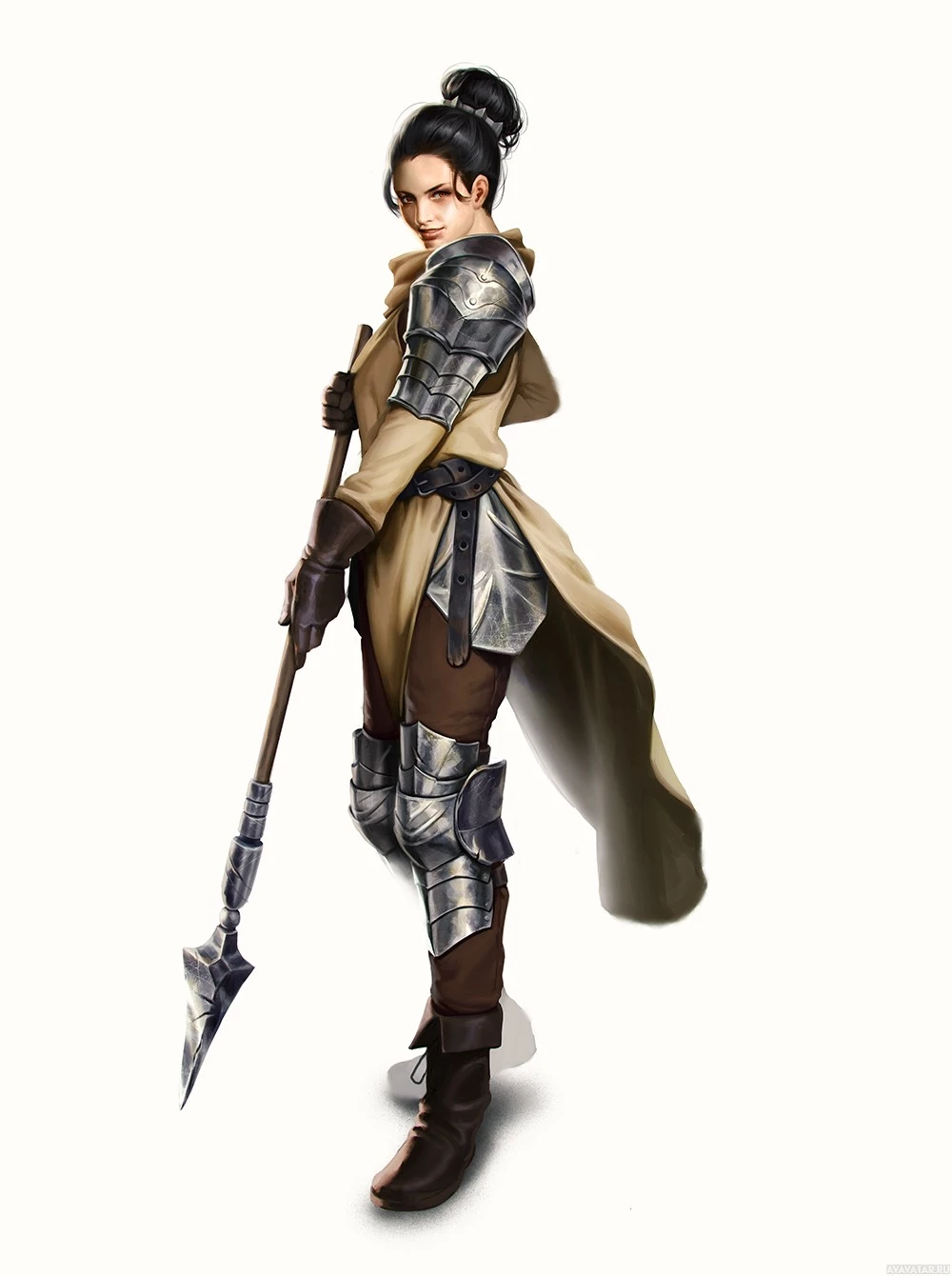 a female character who appears to be a warrior or combatant from a video game, comic book, or fantasy setting. She is wearing armor and holding a spear, which suggests she might be a part of