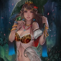 intricate designs, possibly inspired by ancient Greek or Roman fashion, suggesting that she may have a role within her society that involves ceremonial or ritualistic significance. The setting is somewhat mystical, with rain-soaked foliage and flowers blooming under the umbrella she's holding over herself, which adds to