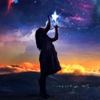 a rocky outcrop with their arms outstretched, reaching towards the sky. In the background, there is a vibrant and colorful nebula, likely representing stars or