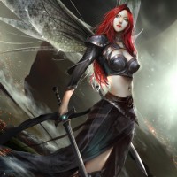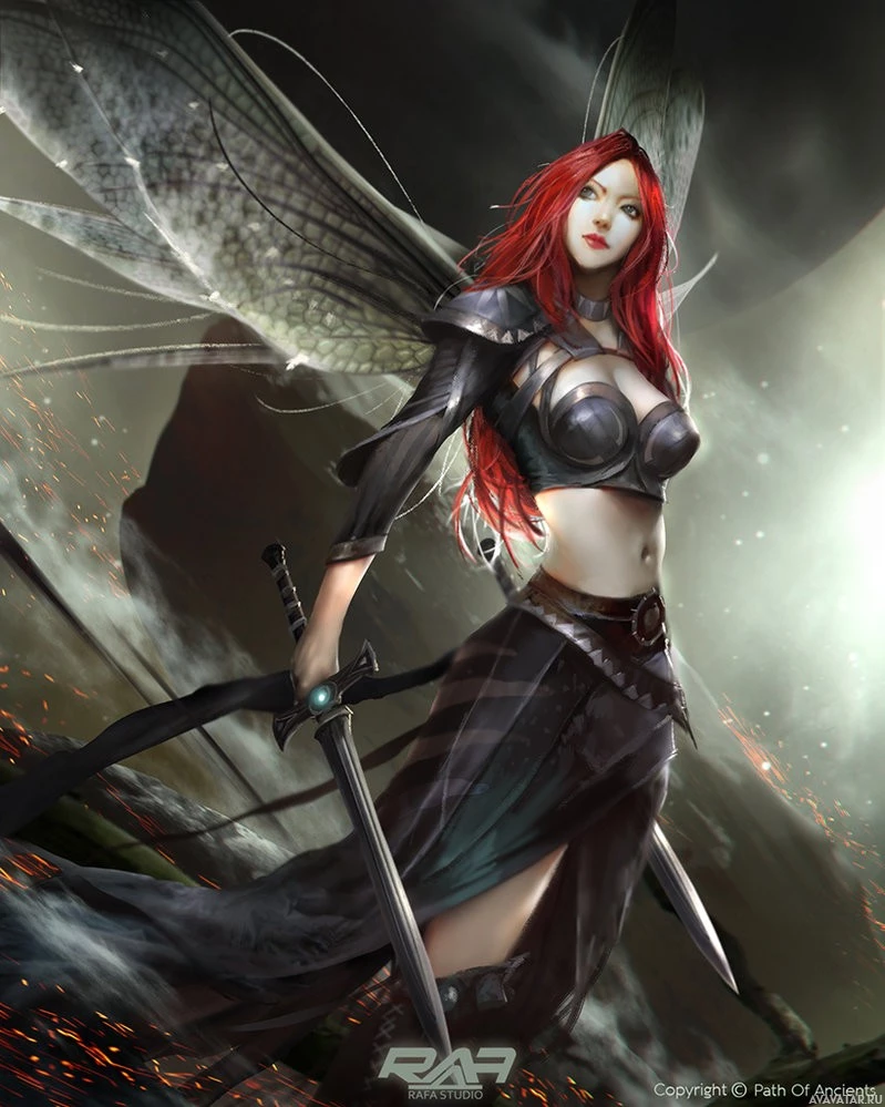 red hair, is wearing a black armor with some ornate details and wings attached to her back, which suggests she might be an angel or a similar mythical creature. In her hands, she holds two swords, one in each hand, indicating that she is likely a warrior or a protector of sorts. The background has dramatic