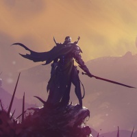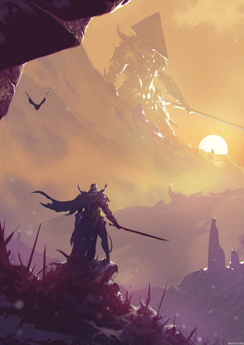 the bottom of the frame, but the content of the text on it is not clear due to the image resolution. The warrior is equipped with a sword and a shield, indicating they are prepared for combat. There is also a raven flying in the sky to the left side of the image.