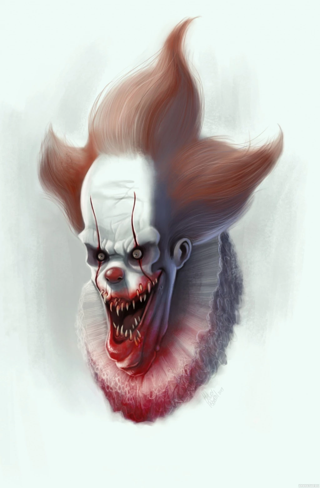 red hair styled to resemble a clown's wig, a menacing grin on his face, and sharp white teeth in a wide-open mouth. The drawing captures